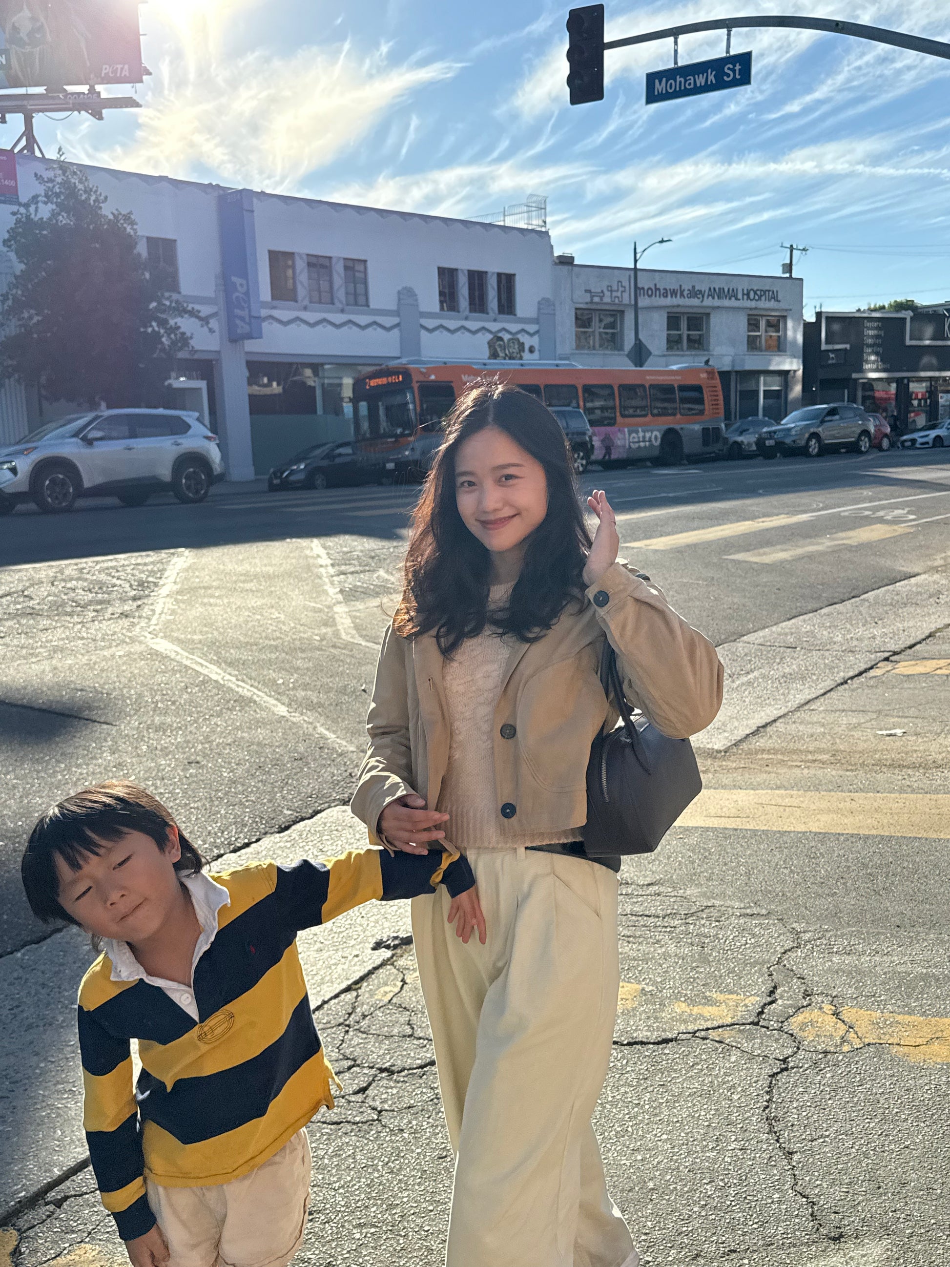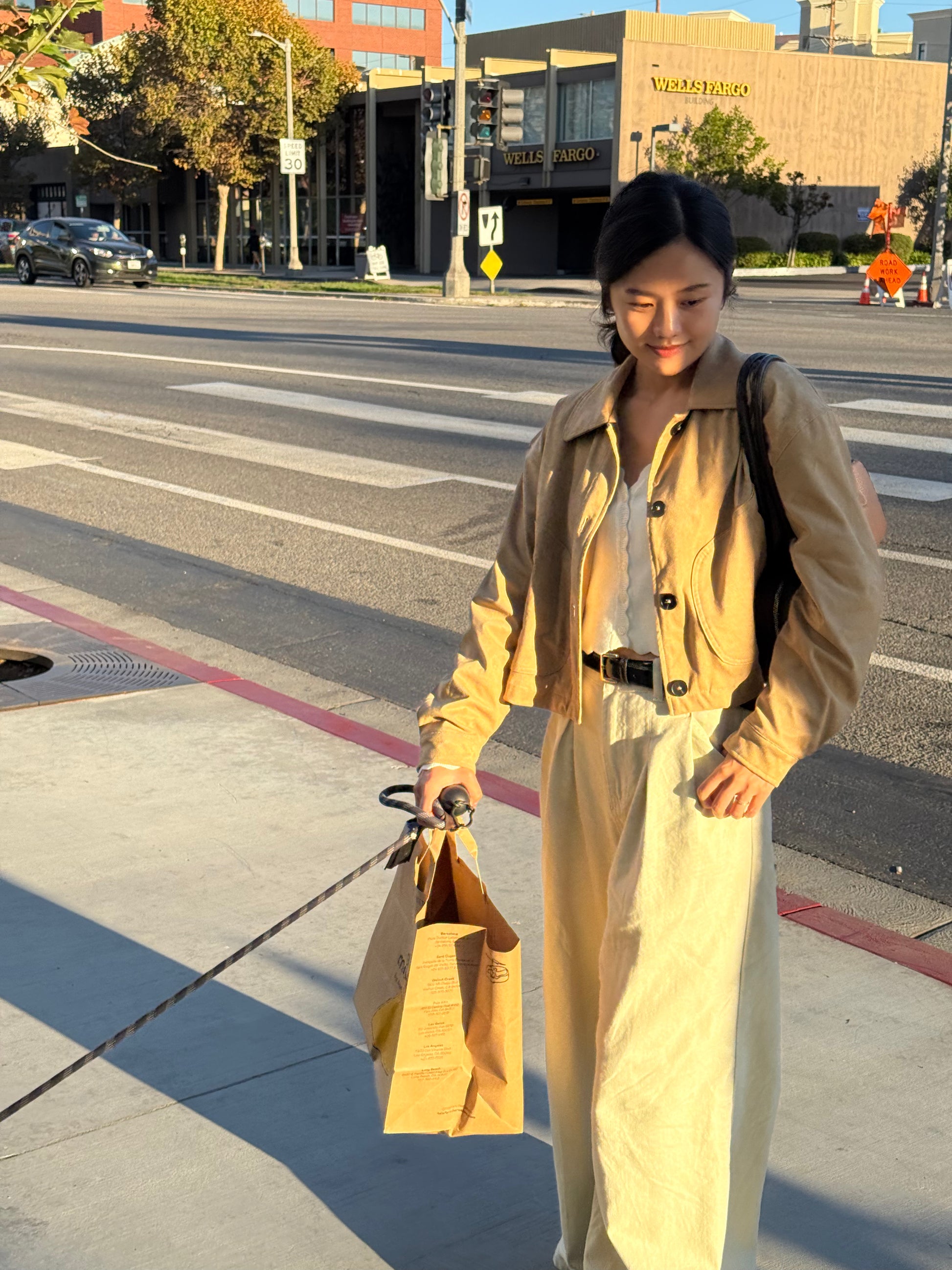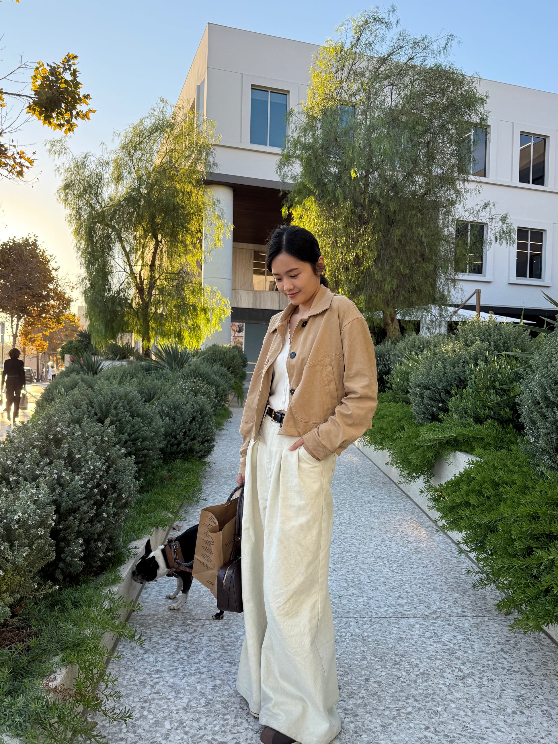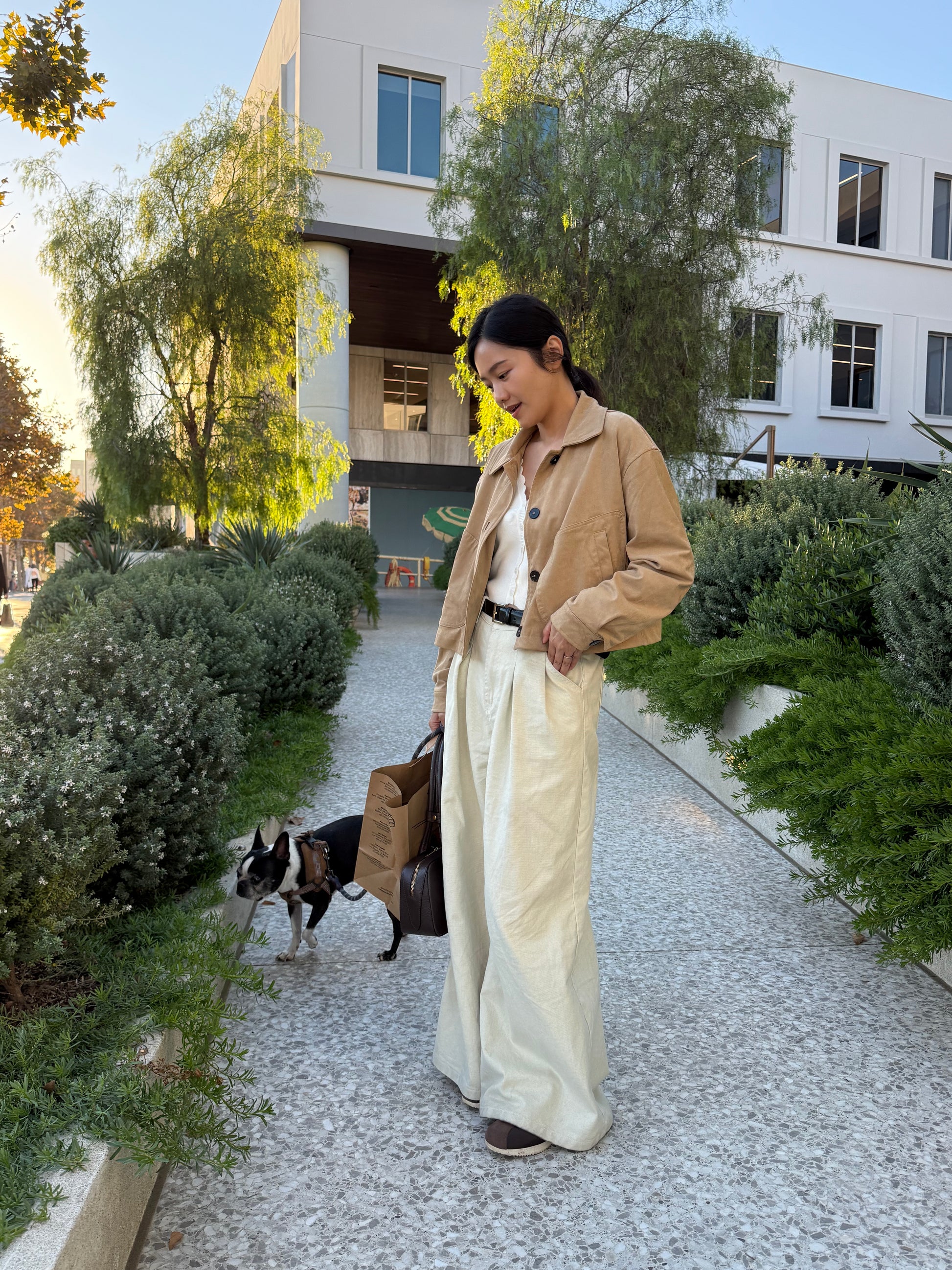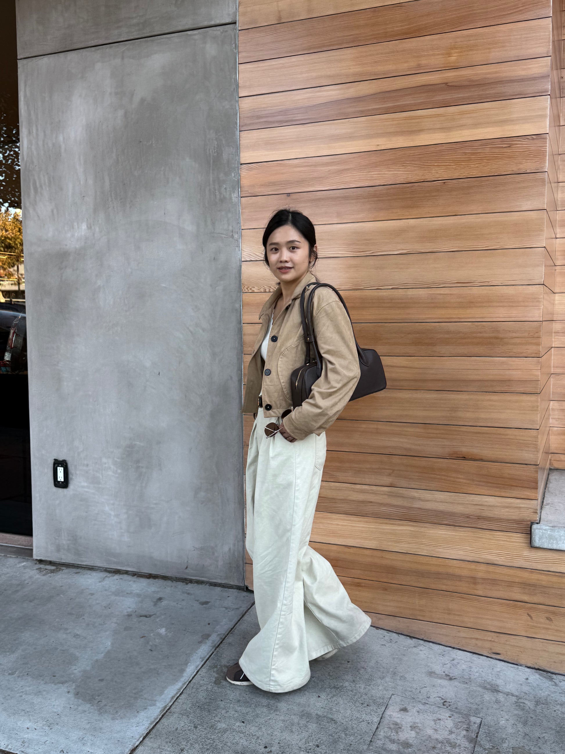 - 크롭 자켓 + A라인 팬츠: 다리를 길고 슬림하게 연출하는 실루엣
