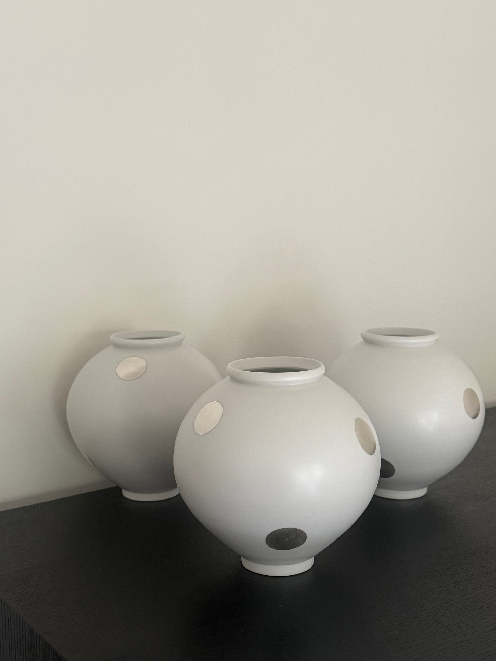 전통 달항아리의 둥글고 유려한 실루엣을 모티프로 제작된 오브제로, 완벽한 구형이 아닌 자연스러운 곡선을 살려 보는 각도마다 다른 아름다움을 보여줍니다.