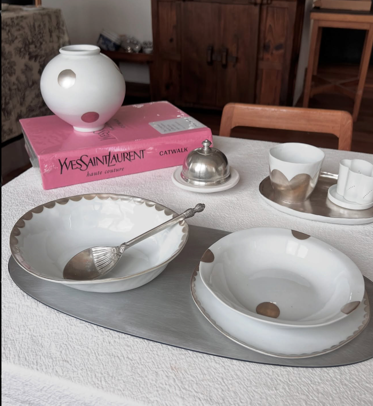 • 디테일: 흰색 백자 바탕 위에 은칠로 도포된 원형 구멍 디테일 — 고전과 현대의 조화로운 만남