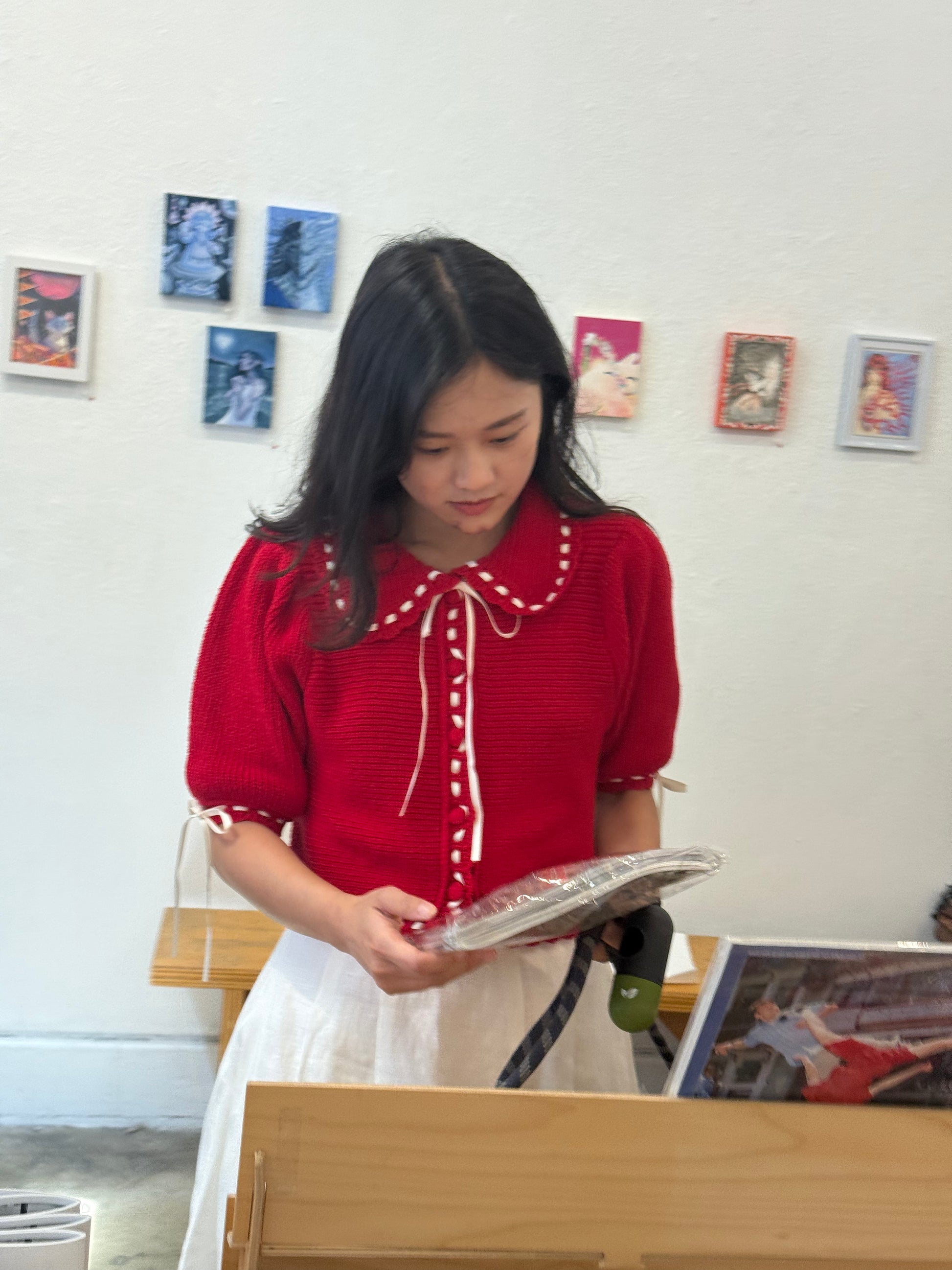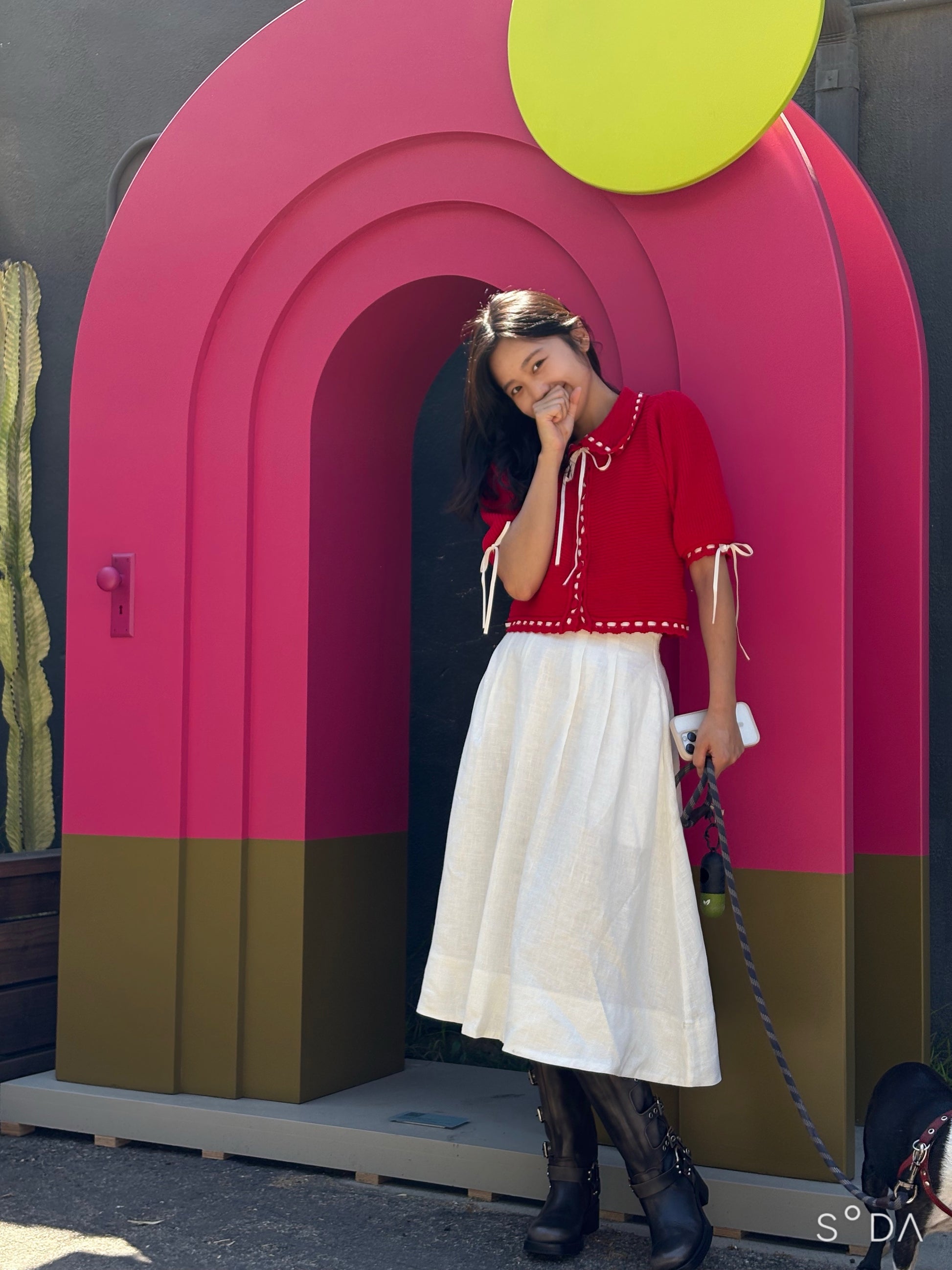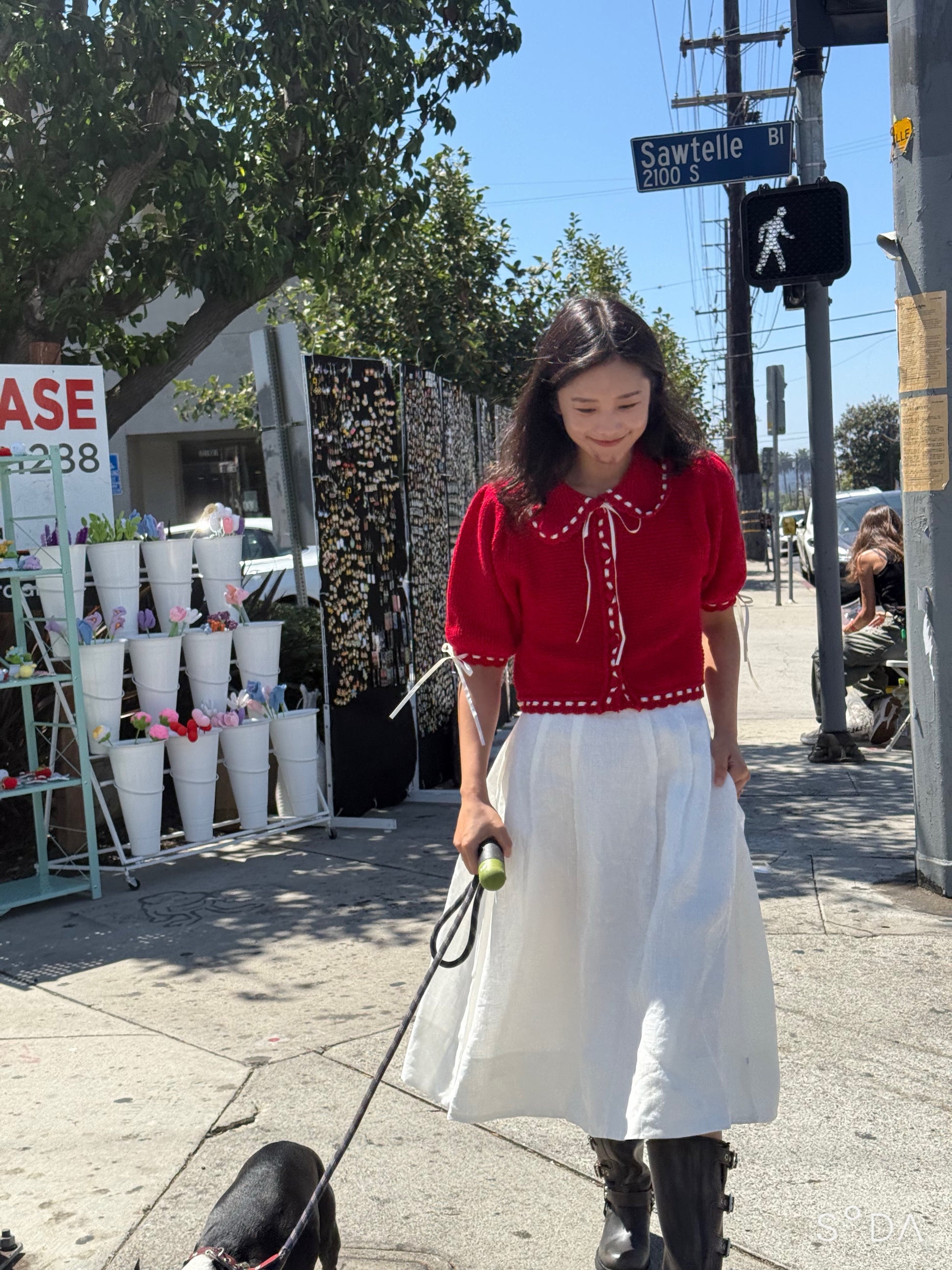 강렬한 레드 컬러가 시선을 사로잡으며, 화이트 리본 트리밍이 조화롭게 어우러져 섬세하면서도 세련된 무드를 완성합니다.