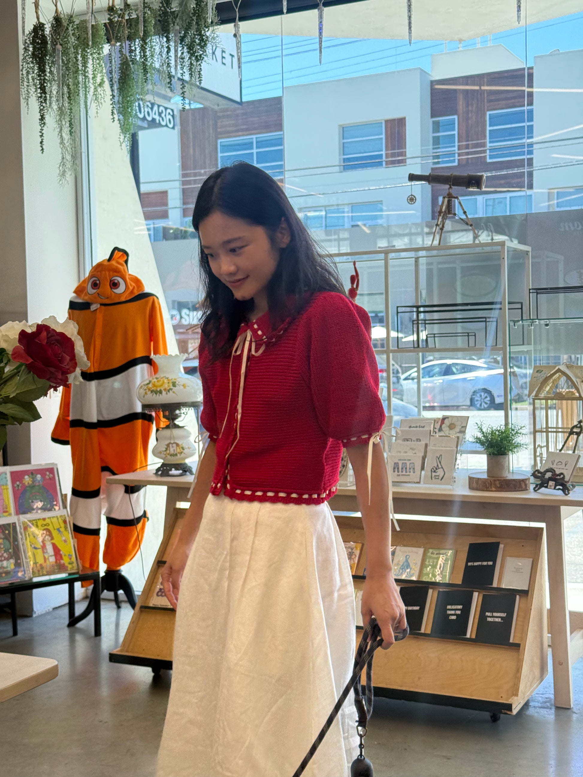 퍼프 소매와 크롭 기장의 실루엣은 경쾌하면서도 여성스러운 라인을 강조해 주며, 네크라인과 소매에 더해진 리본 디테일은 감각적인 포인트가 되어줍니다.